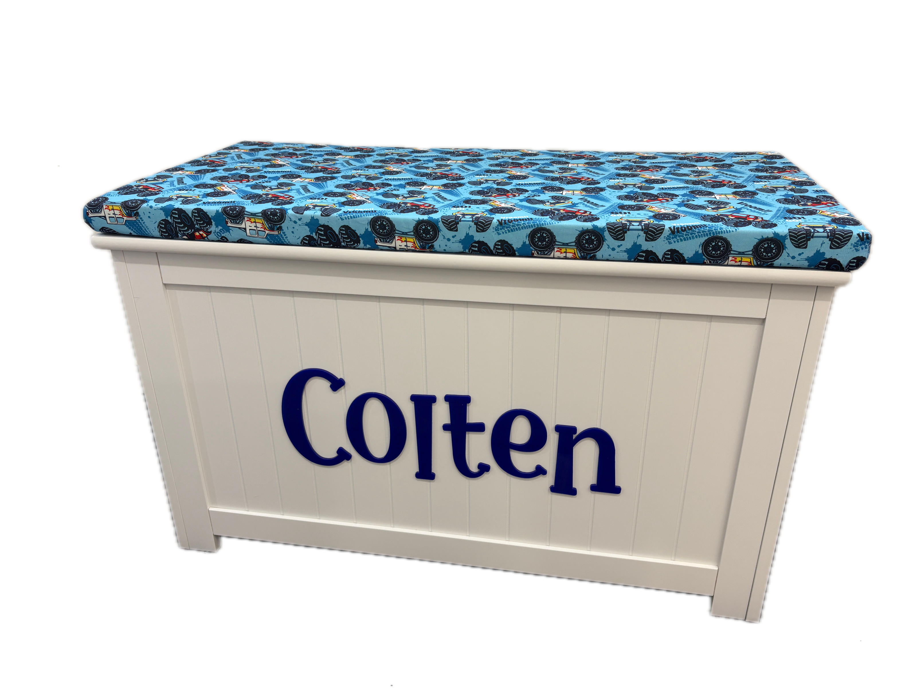 Monster Truck fabric top with dark bright blue acrylic name in Font D.